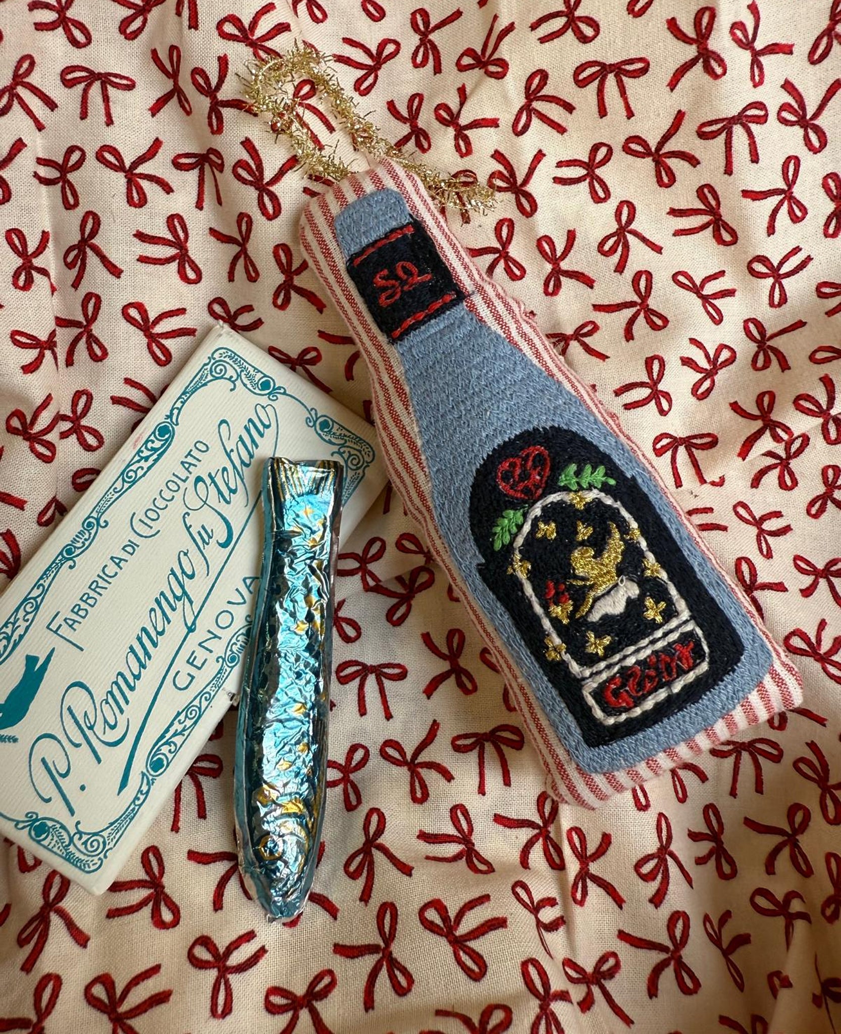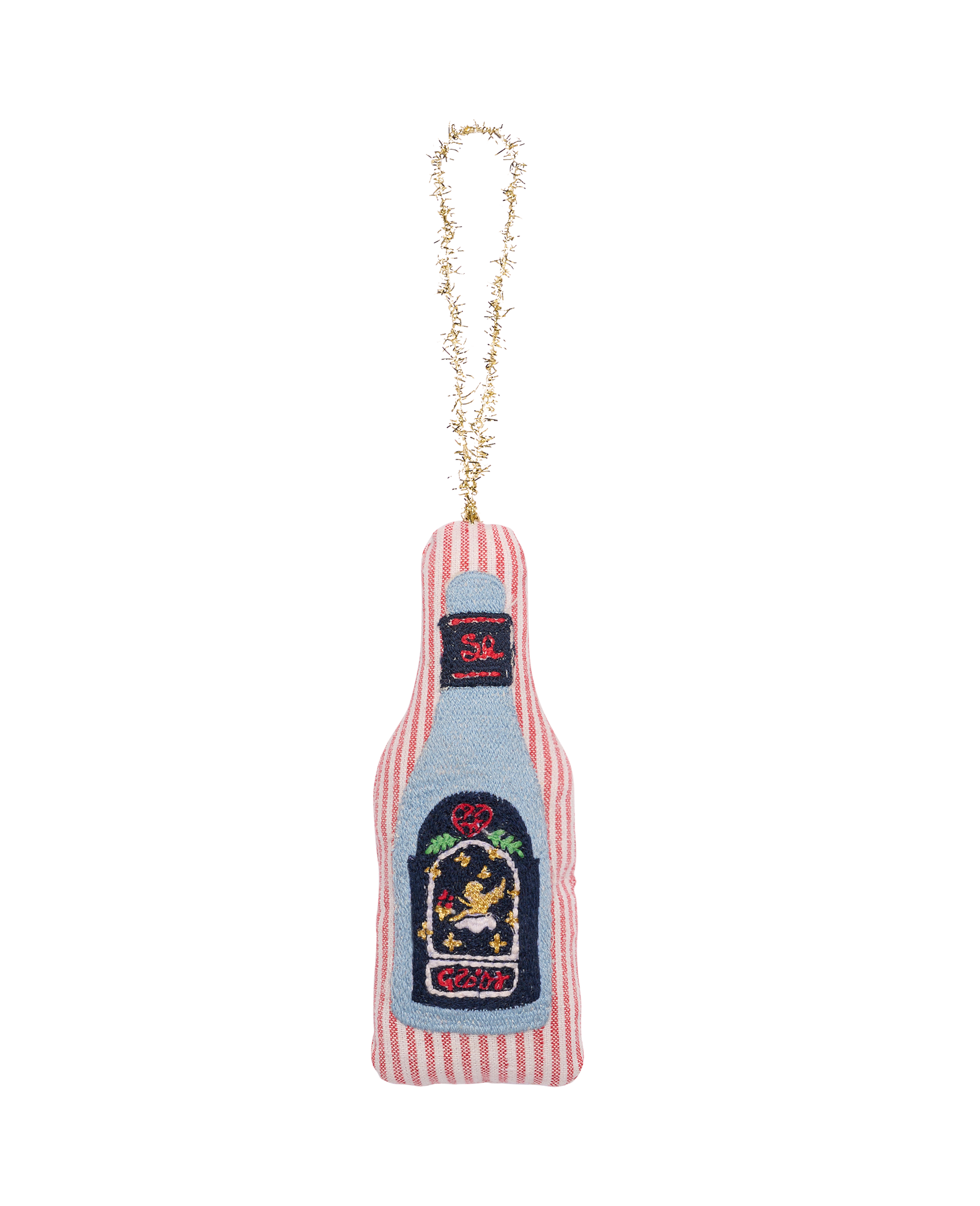 Christmas Bottle er lavet af rester af stof og er let polstret. Den har en detaljeret brodering af en flaske gløgg, en traditionel dansk juledrik. Den er perfekt til at pynte det mest festlige juletræ og sprede julestemning i hele huset!
