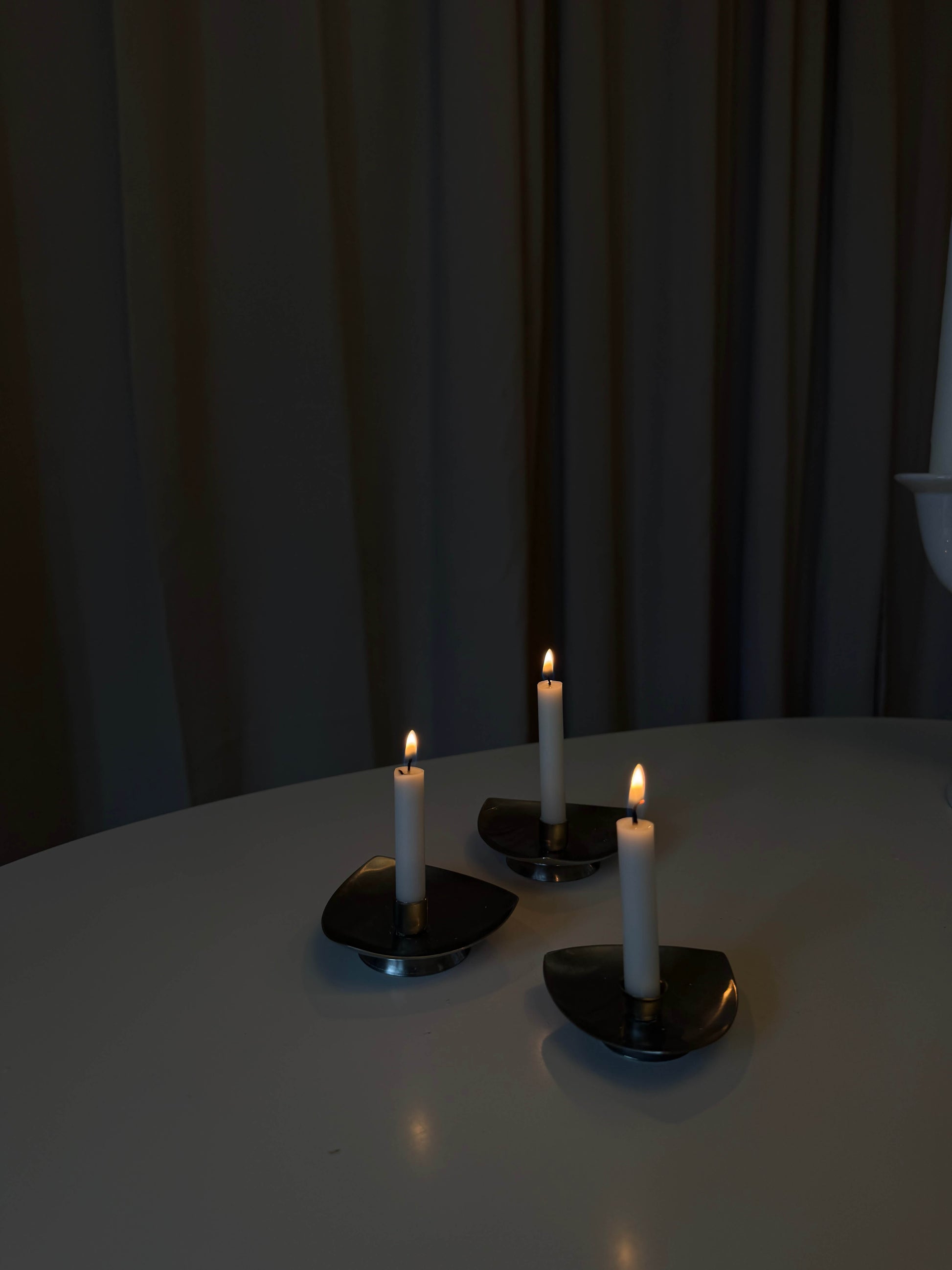 En stilren lysholder i rustfrit stål, designet til kertelys, der kombinerer funktionalitet med elegant, nordisk design. Den enkle form fremhæver lysene og skaber et smukt, dekorativt udtryk på bordet, hylden eller i vindueskarmen.