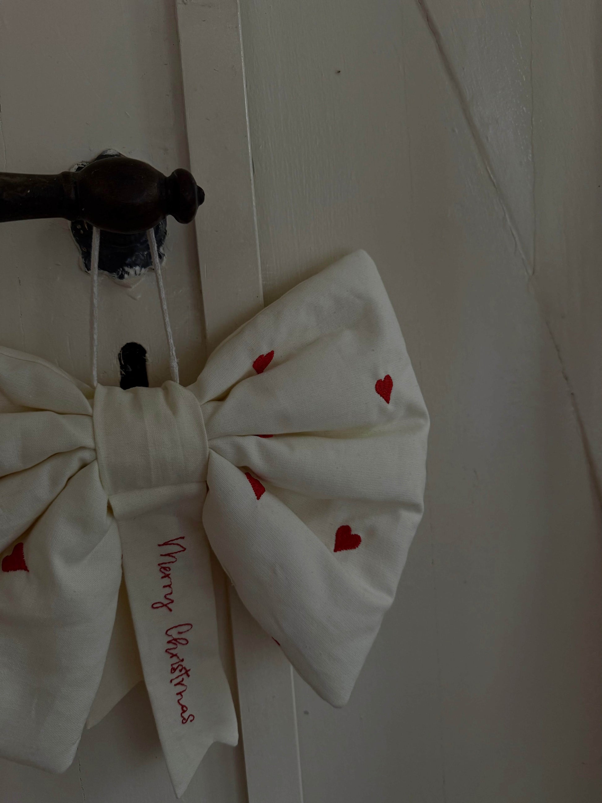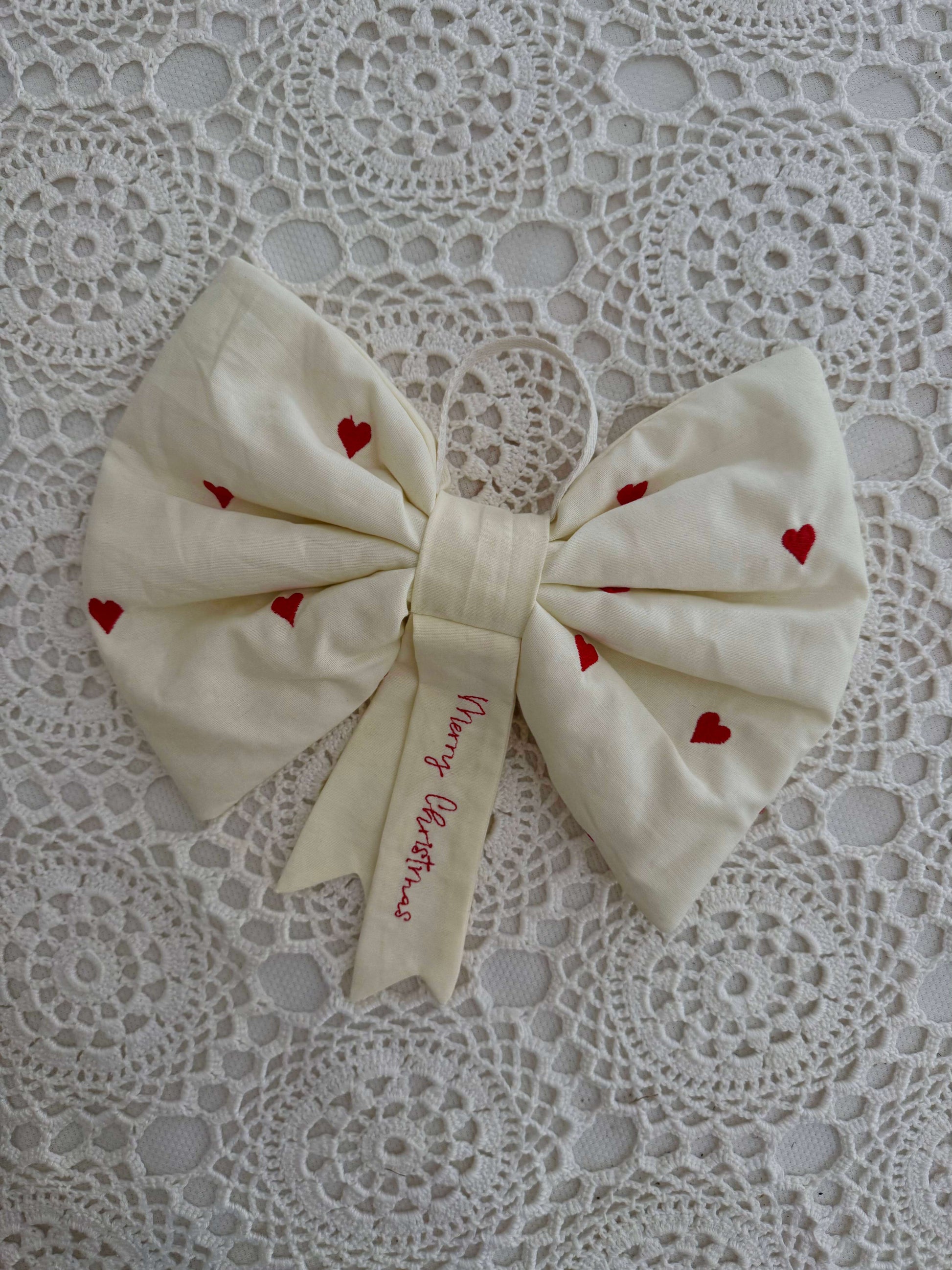 Tilføj et strejf af nostalgi til din julepynt med denne charmerende polstrede julesløjfe i farven butter yellow. Sløjfen er dekoreret med broderede røde hjerter og teksten Merry Christmas, som skaber klassisk og varm julestemning i hjemmet.