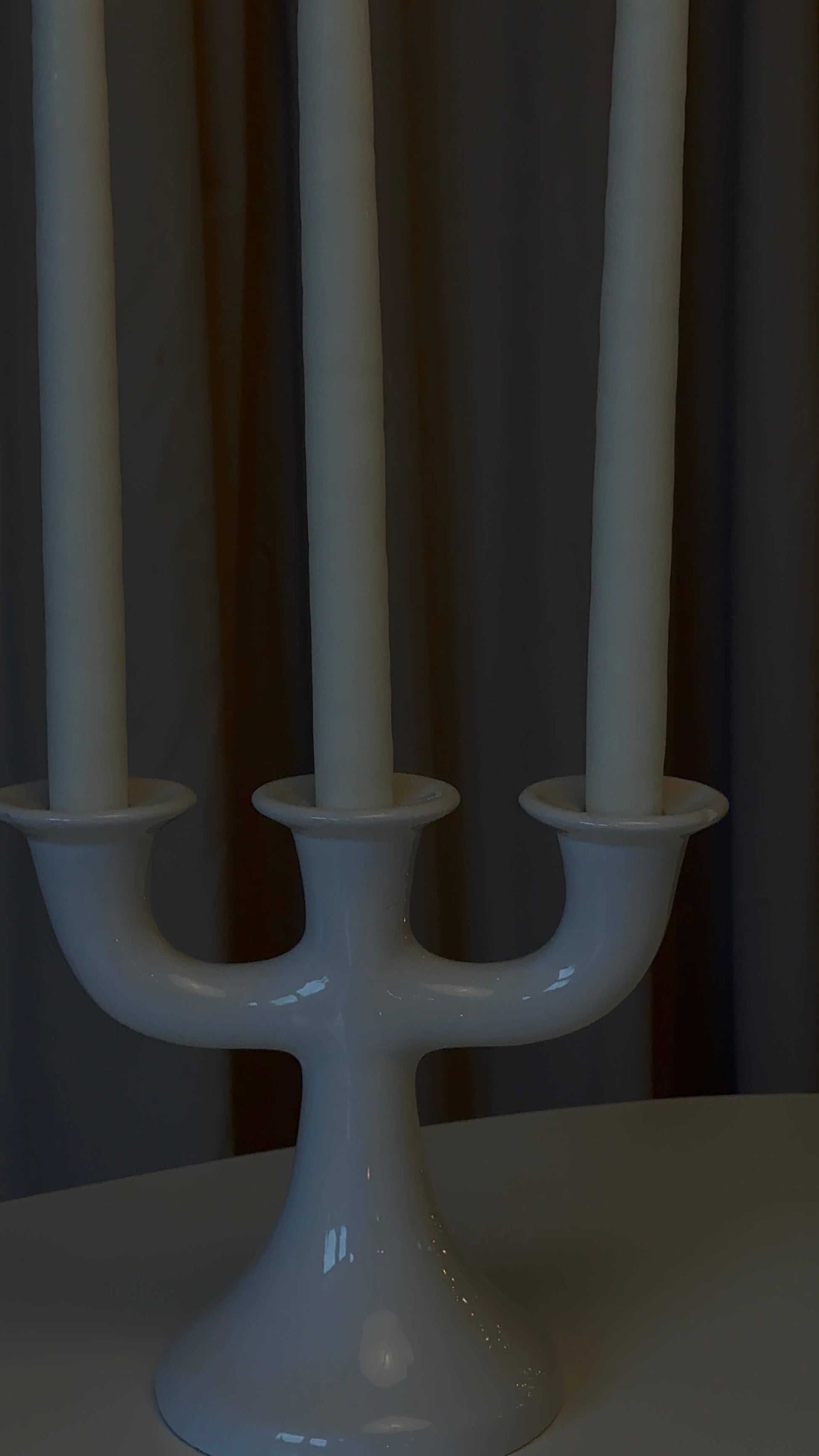 En elegant lysestage i hvid porcelæn med tre hoveder, der giver plads til flere lys og skaber en hyggelig, stemningsfuld atmosfære. Den glatte, matte overflade og de rene linjer fremhæver porcelænets enkle skønhed, mens designet med tre lys giver et dekorativt og balanceret udtryk på bordet, hylden eller vindueskarmen.