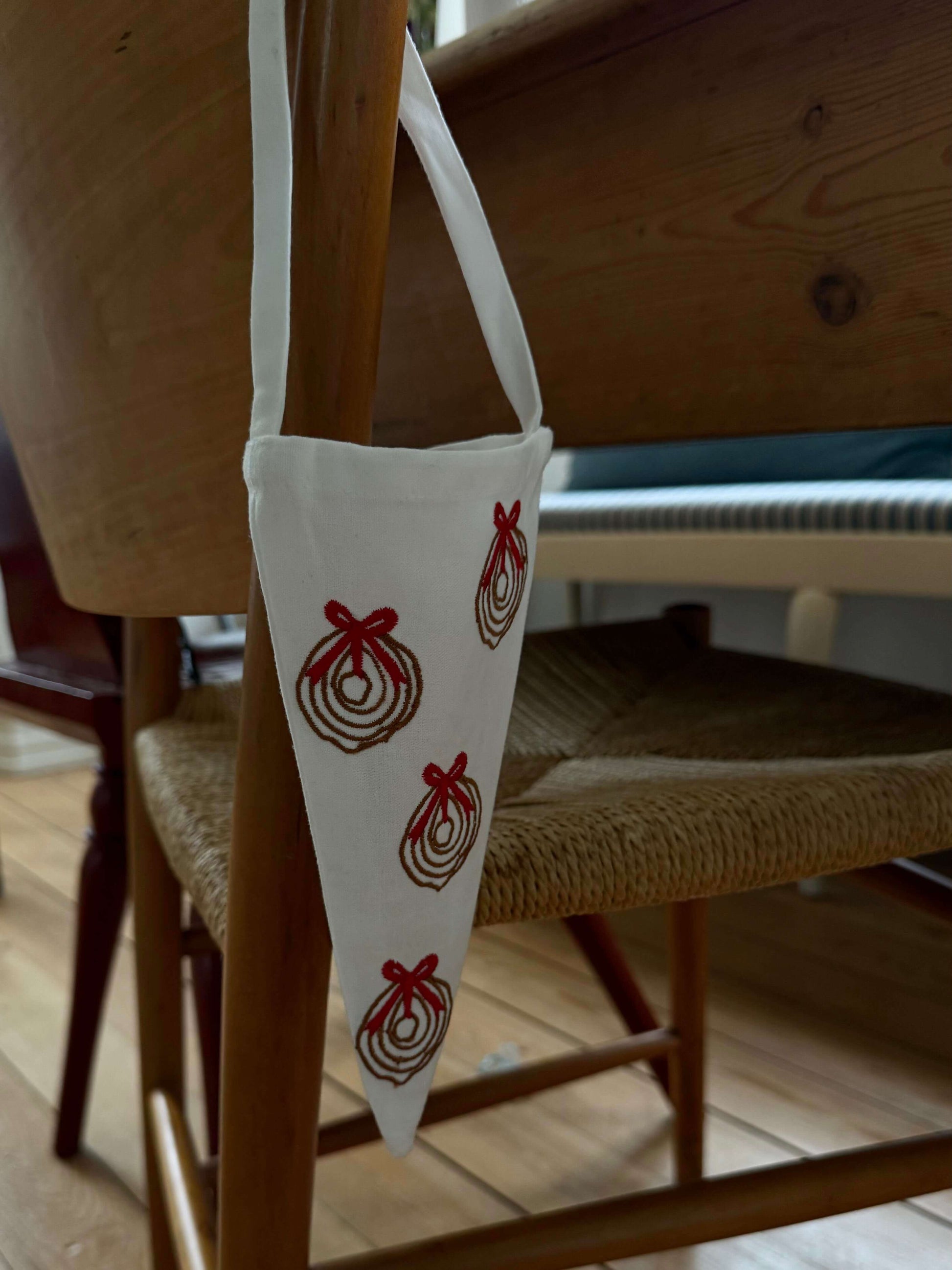 Hver Christmas Cone er pyntet med en sirligt broderet vaniljekrans og en rød sløjfe, der giver varme og farve til din juledekoration. Hæng den på juletræet, på en knage i køkkenet eller som et lille øjeblik af jul på en skabsdør 🎁