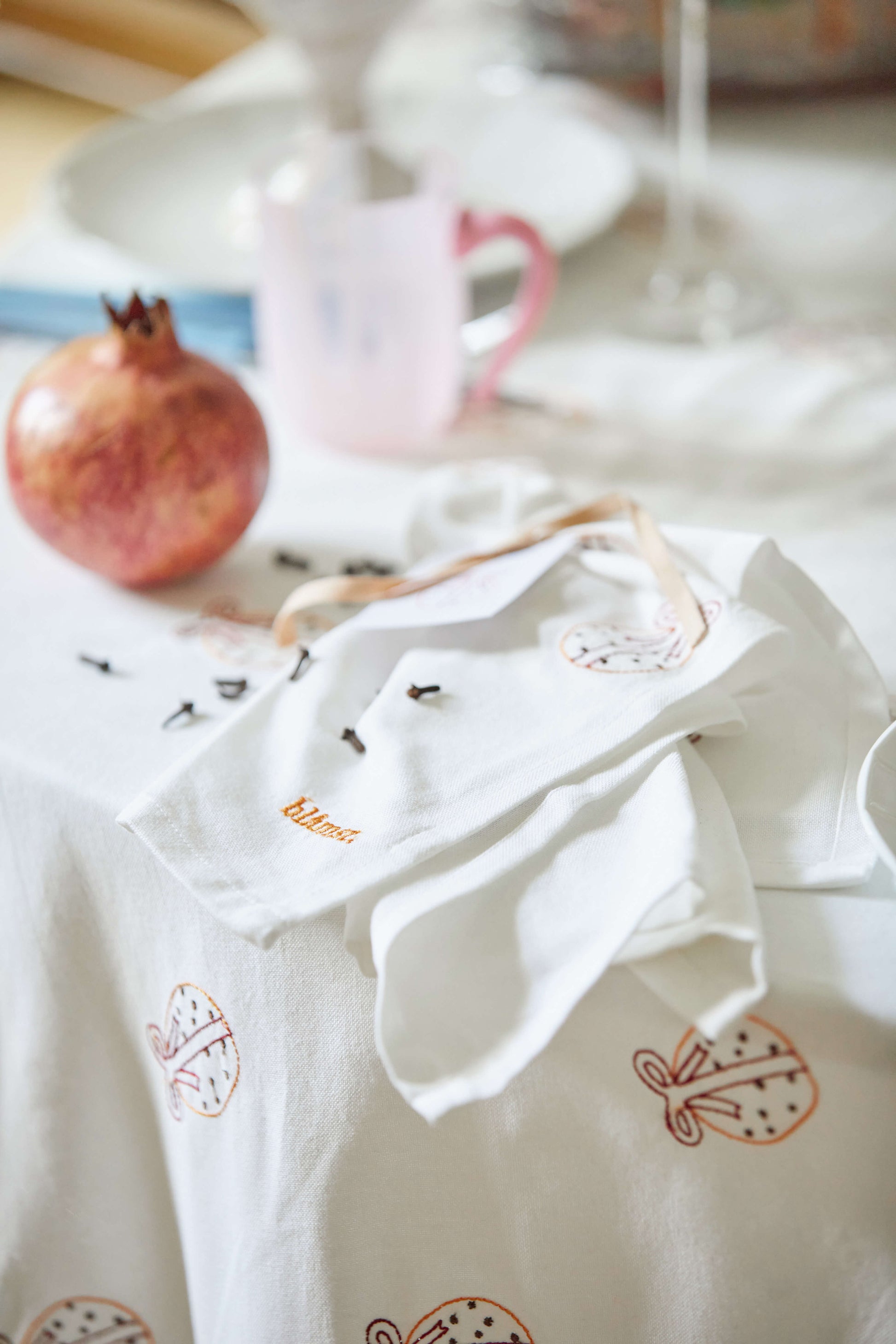 Tilføj en duft af jul til bordet med vores Orange stofservietter. Broderet med håndtegnede appelsiner og nelliker, er disse servietter perfekte til juletidens sammenkomster. Lavet af 100% økologisk bomuld og designet til at bringe varme og hygge til dine julemåltider.
