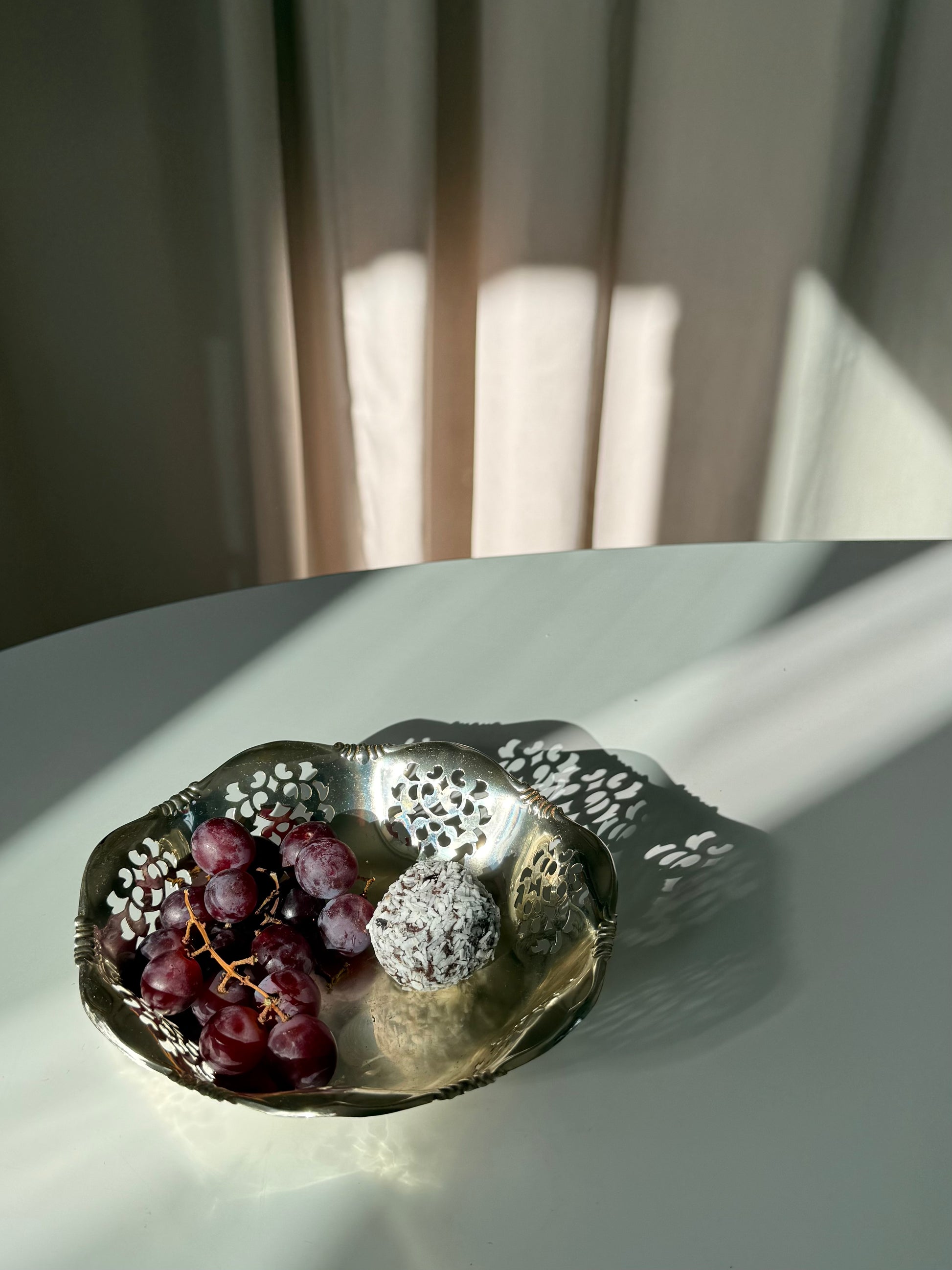 Et lille stålfad i flot, dekorativt mønster – enkelt og tidløst i sit udtryk 🤍