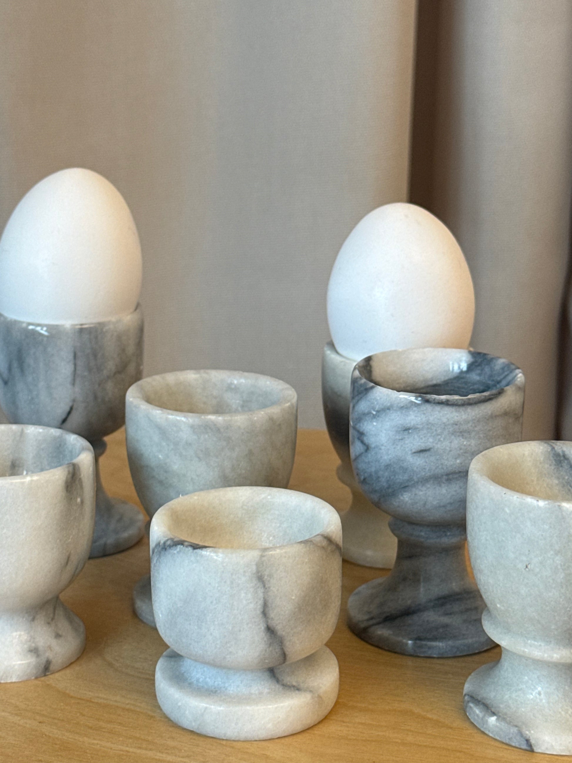 Smukke æggebægre i marmor – hver med sin egen fine nuance og naturlige struktur. Et roligt og elegant indslag på morgenbordet 🤍
