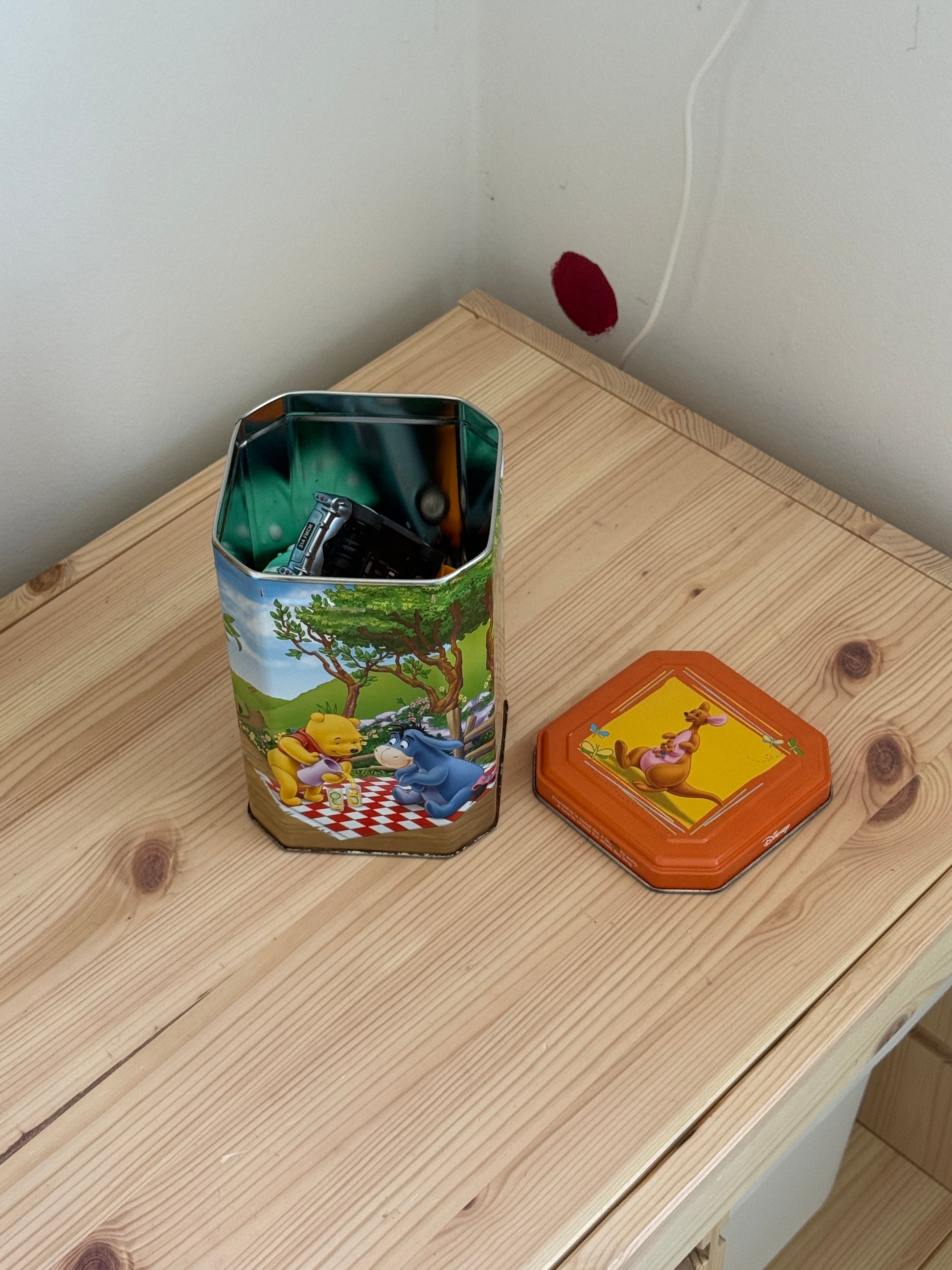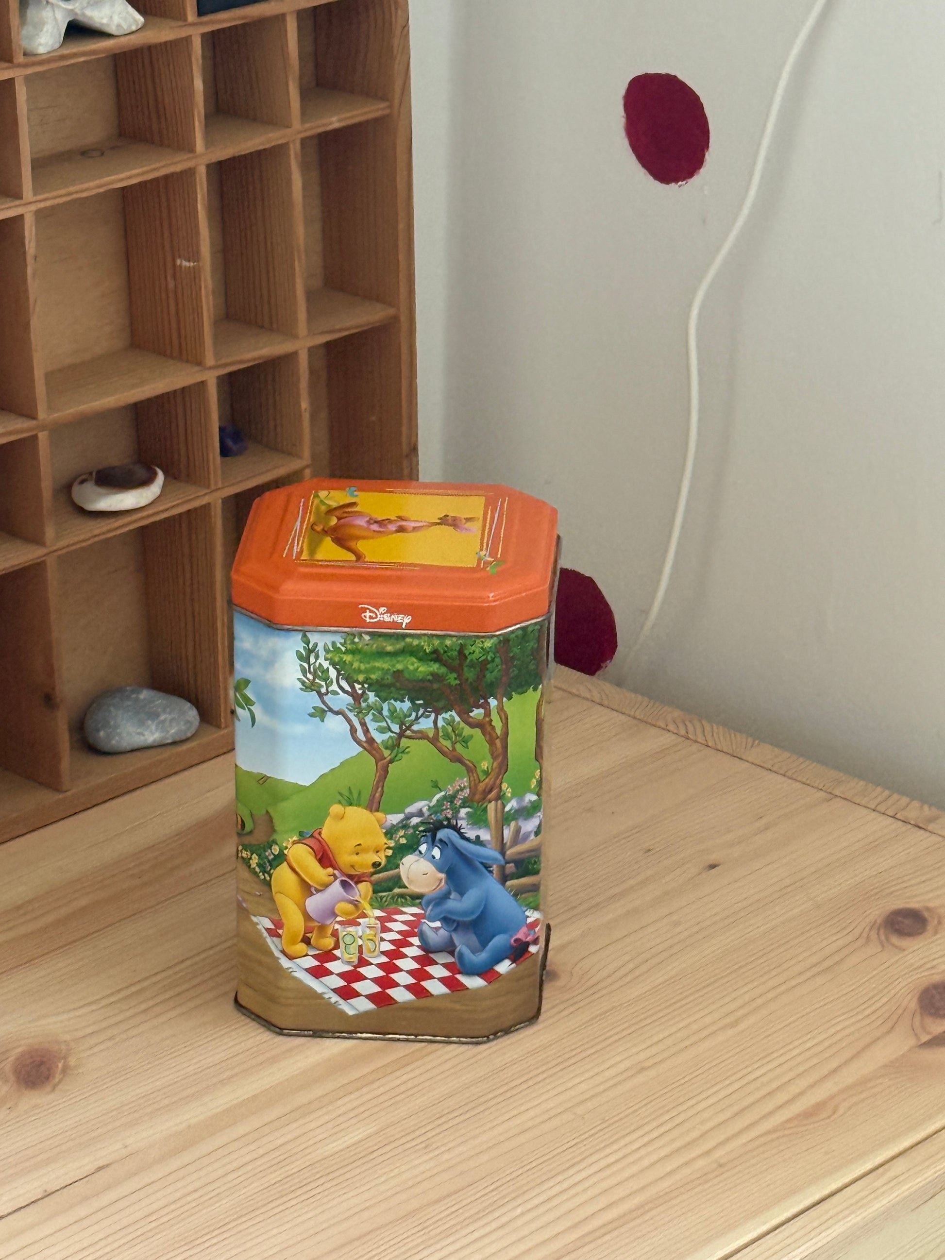 En fin metaldåse med Peter Plys og vennerne. Et hyggeligt og genkendeligt motiv, der bringer varme og personlighed ind på børneværelset 🤍