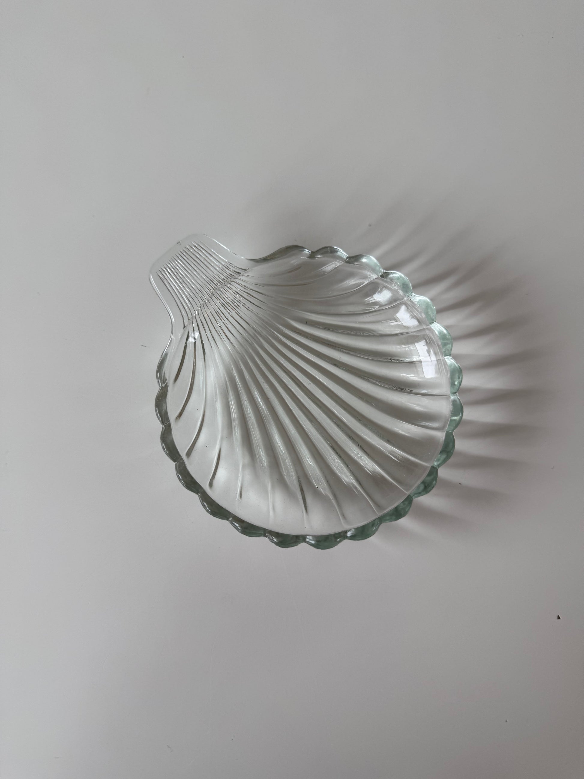 Et lille dekorativt glasfad formet som en musling. Et fint og poetisk stykke, der leder tankerne mod havet og naturens rolige former đ€