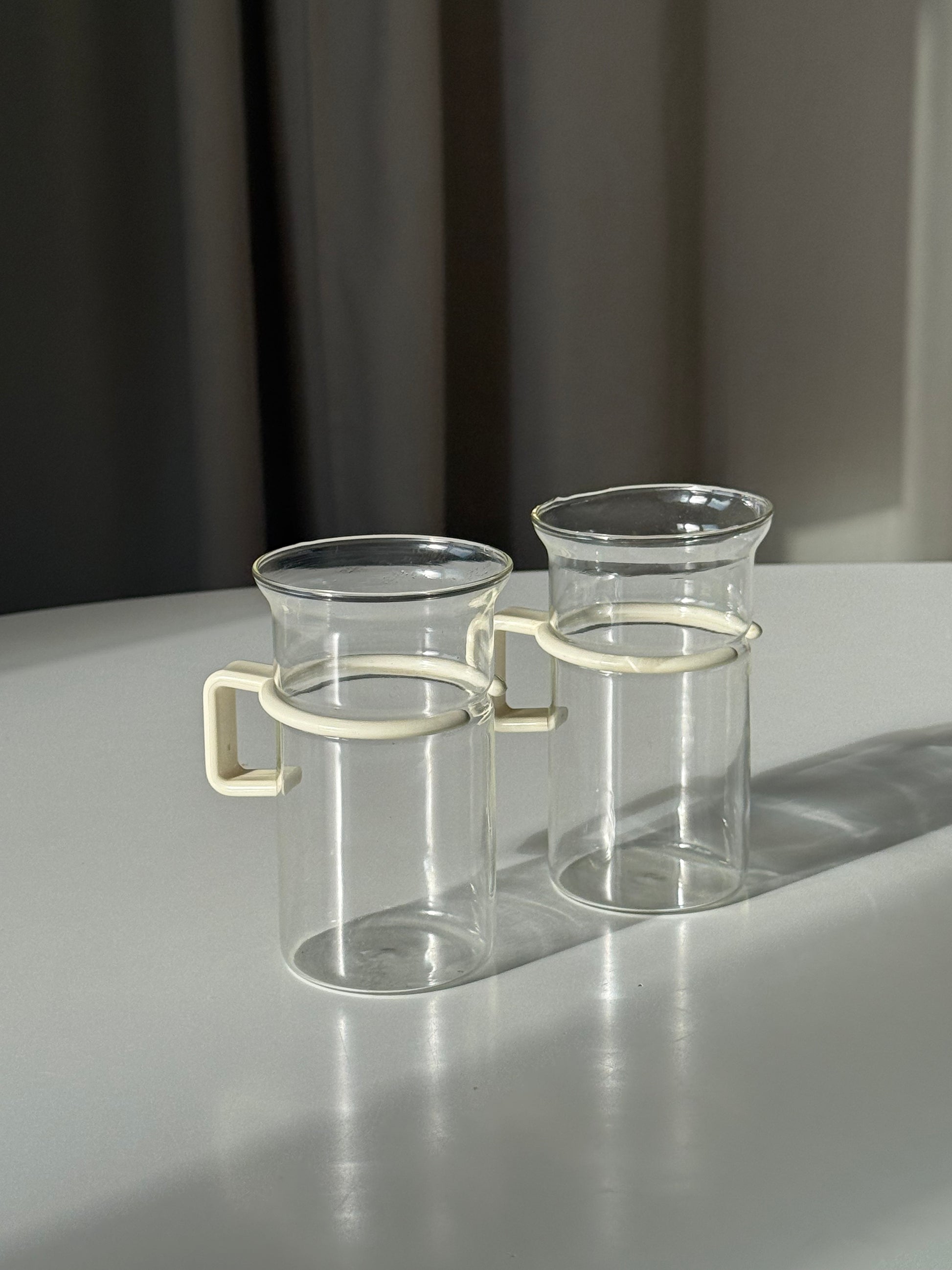 Flotte kaffeglas med hvid plastik hank i et skønt retro look. En fin kombination af klart glas og den karakteristiske lyse hank, der giver både nostalgi og funktion 🤍