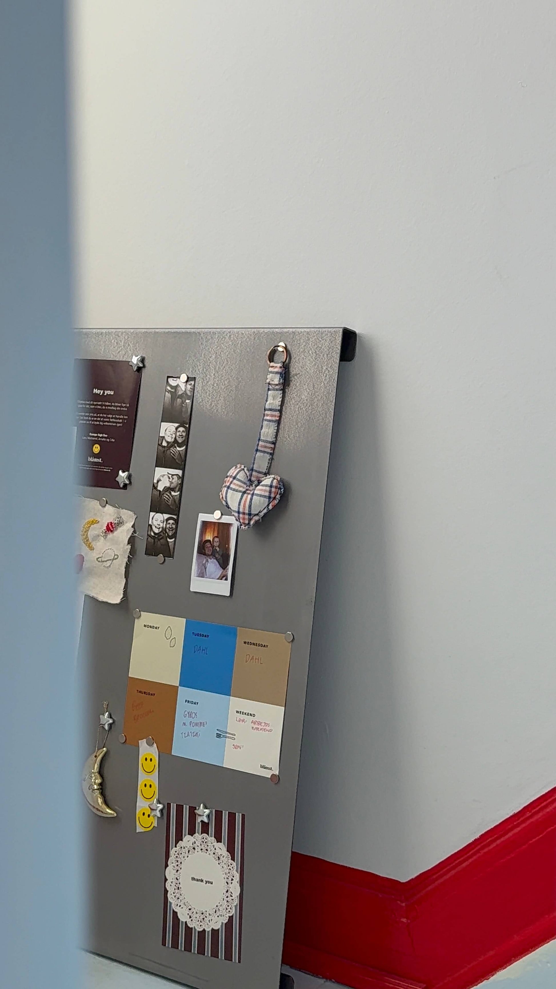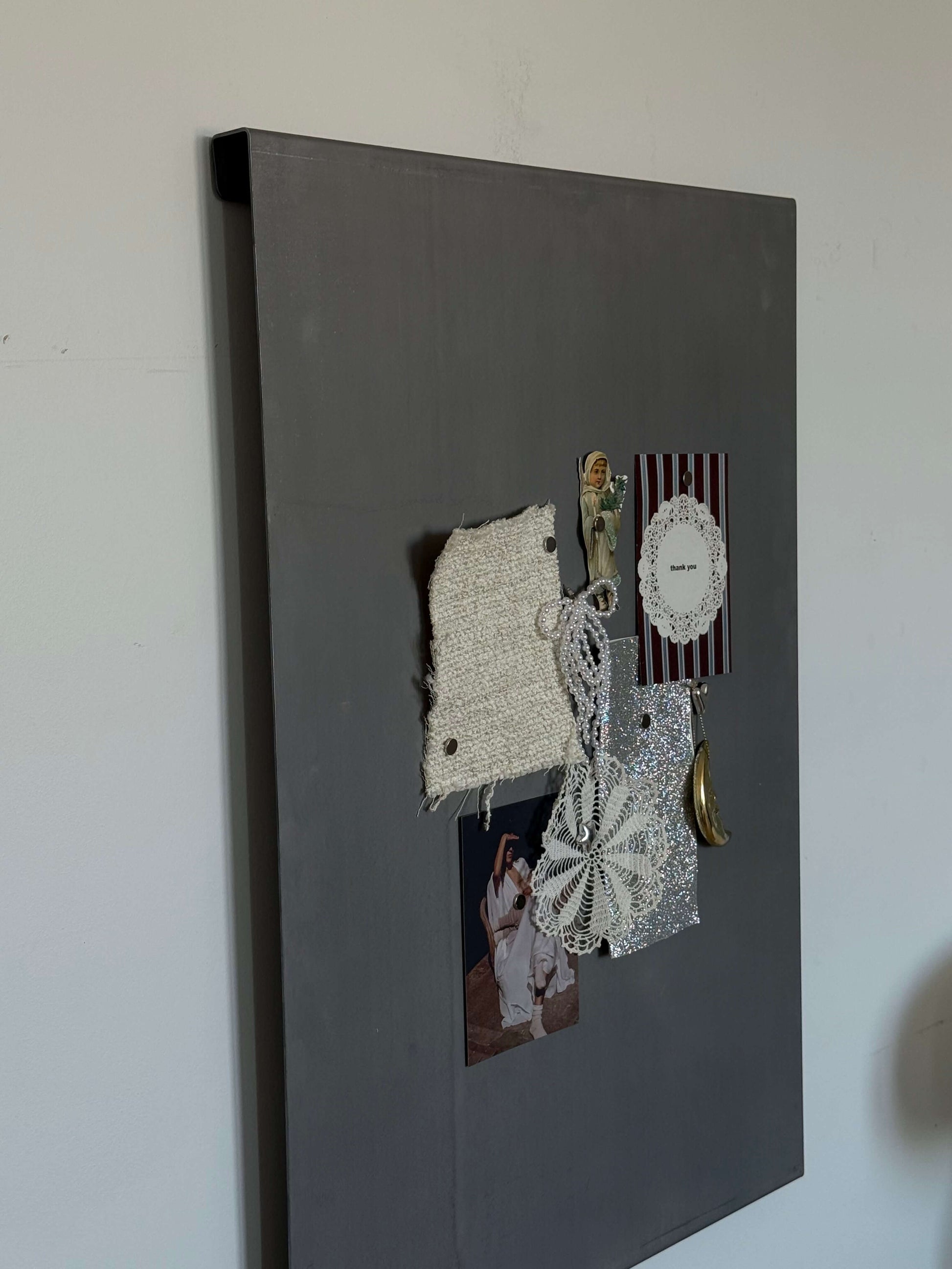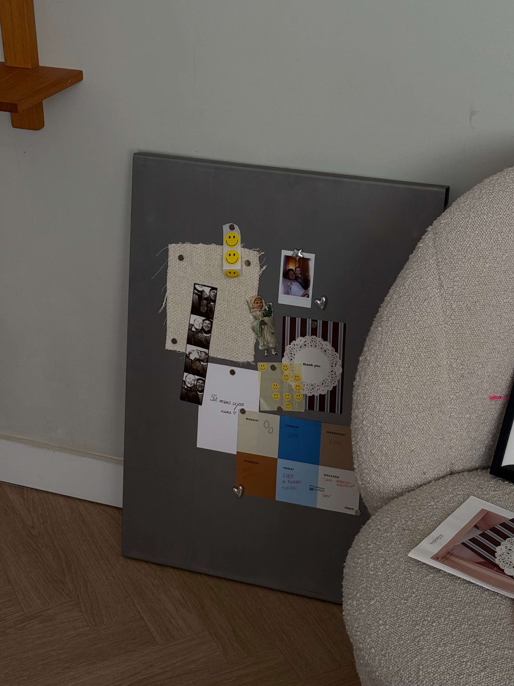 Opslagstavlen er udformet med et diskret buk i top og bund, hvor der er indfræsede huller til ophæng. Det skaber et svævende og minimalistisk udtryk på væggen. Samtidig danner bukket et lille, praktisk hulrum – perfekt til kuglepenne, tegninger der venter på at blive hængt op, eller ekstra magneter.