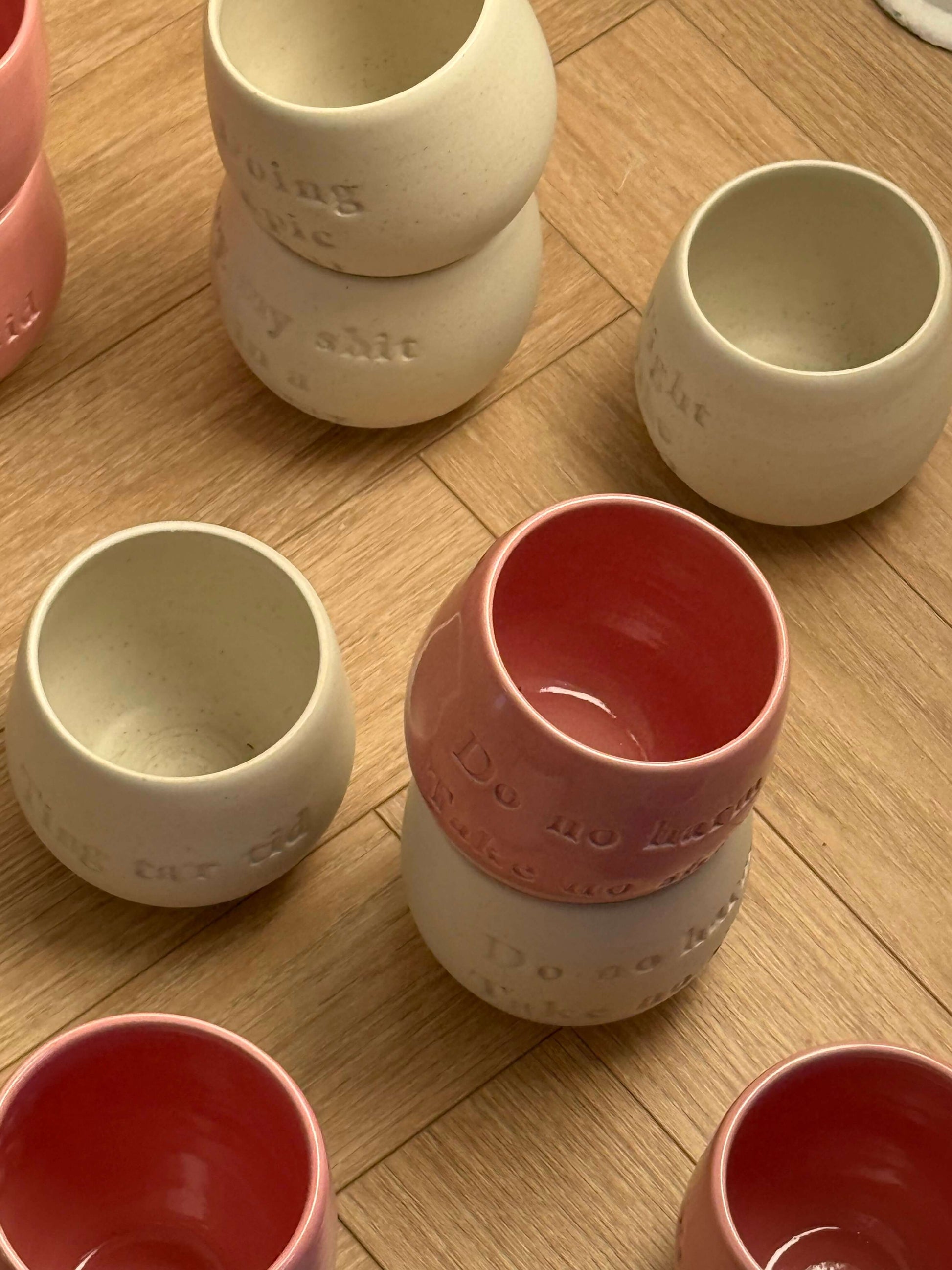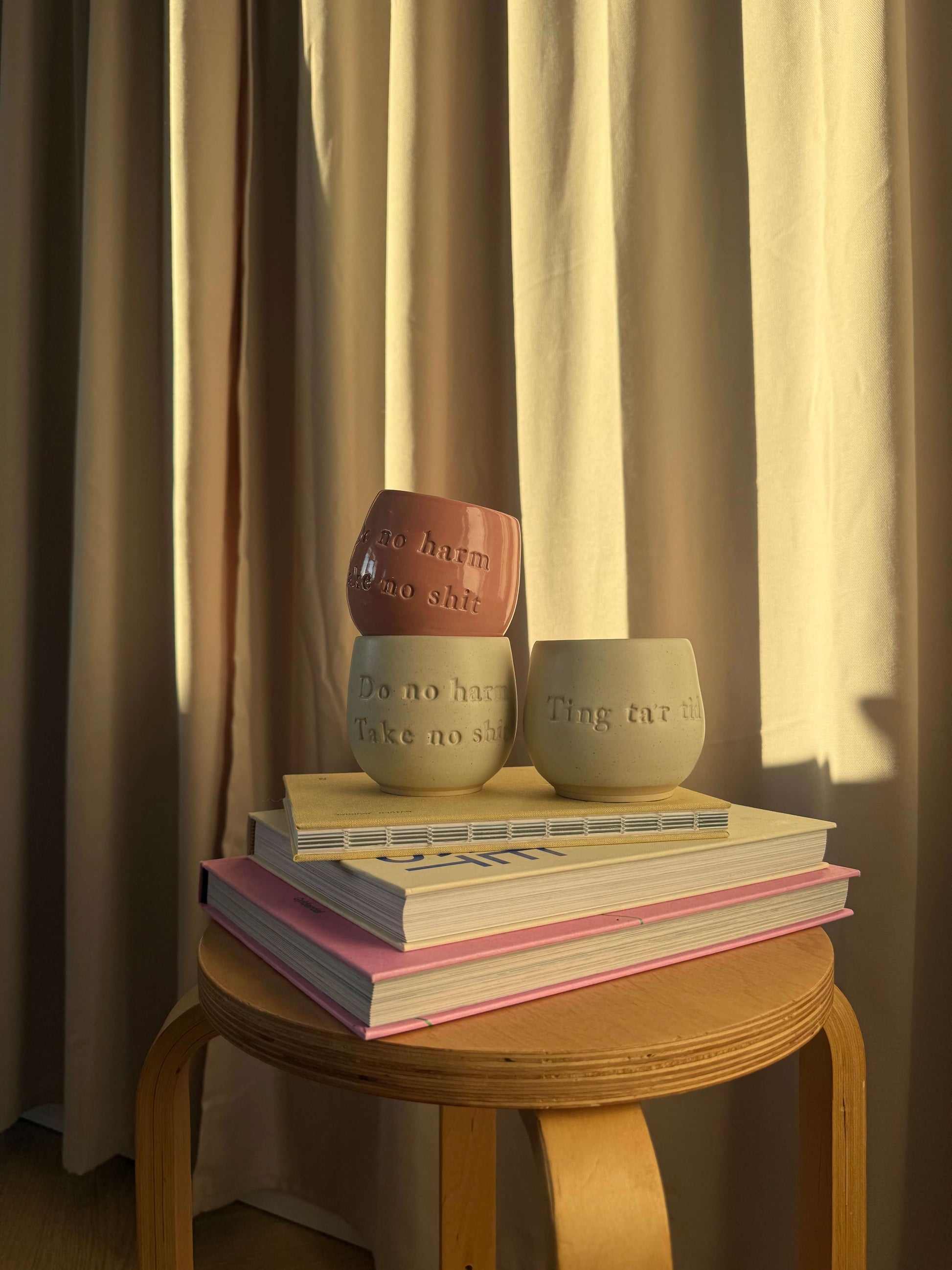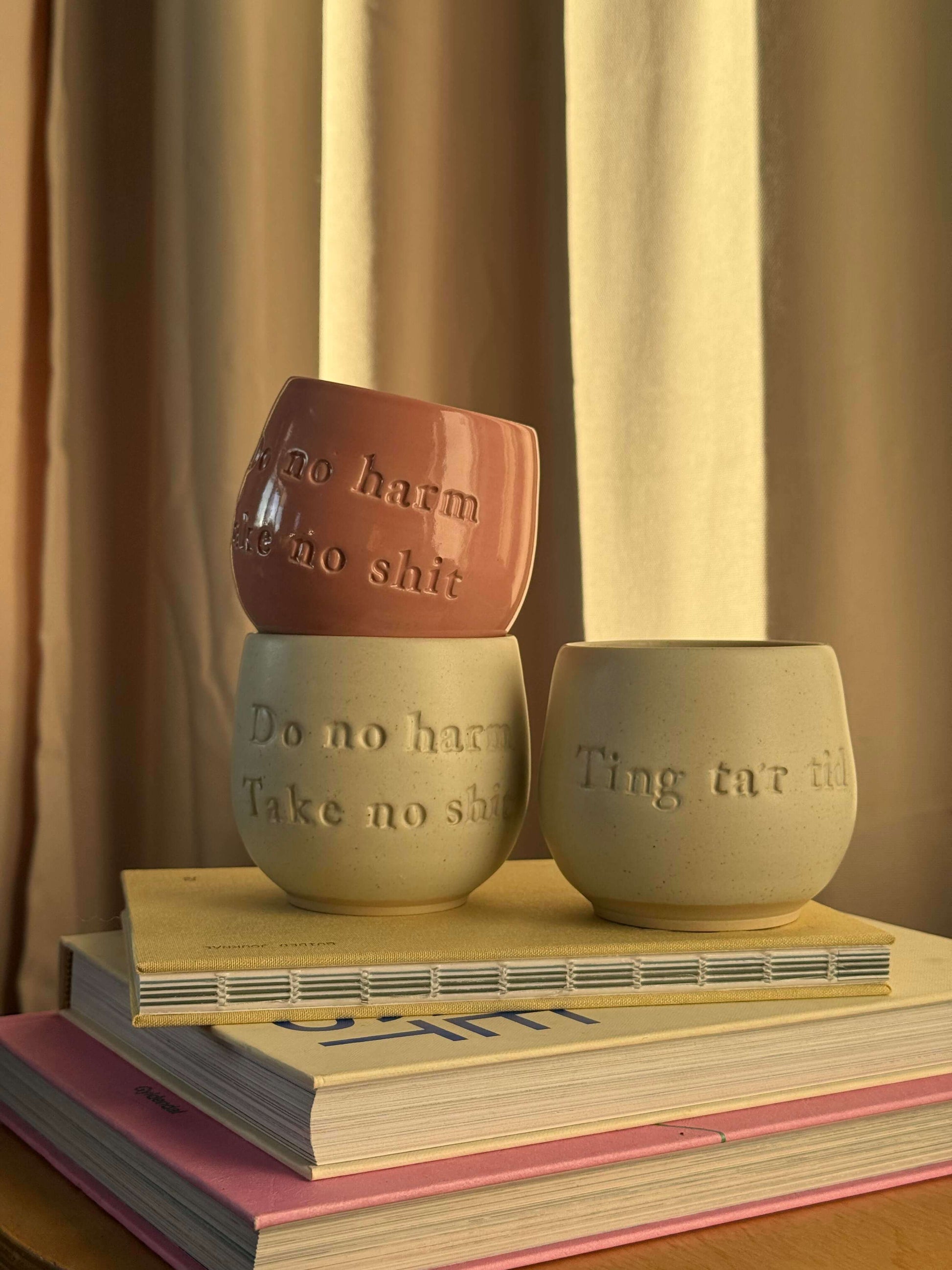 Disse statement-kopper er alle hånddrejet i Danmark af Jahaa Keramik. Hver enkelt kop er formet i hånden og bærer sit eget unikke udtryk – med små variationer i farve, form og størrelse, som vidner om det ægte håndværk bag.