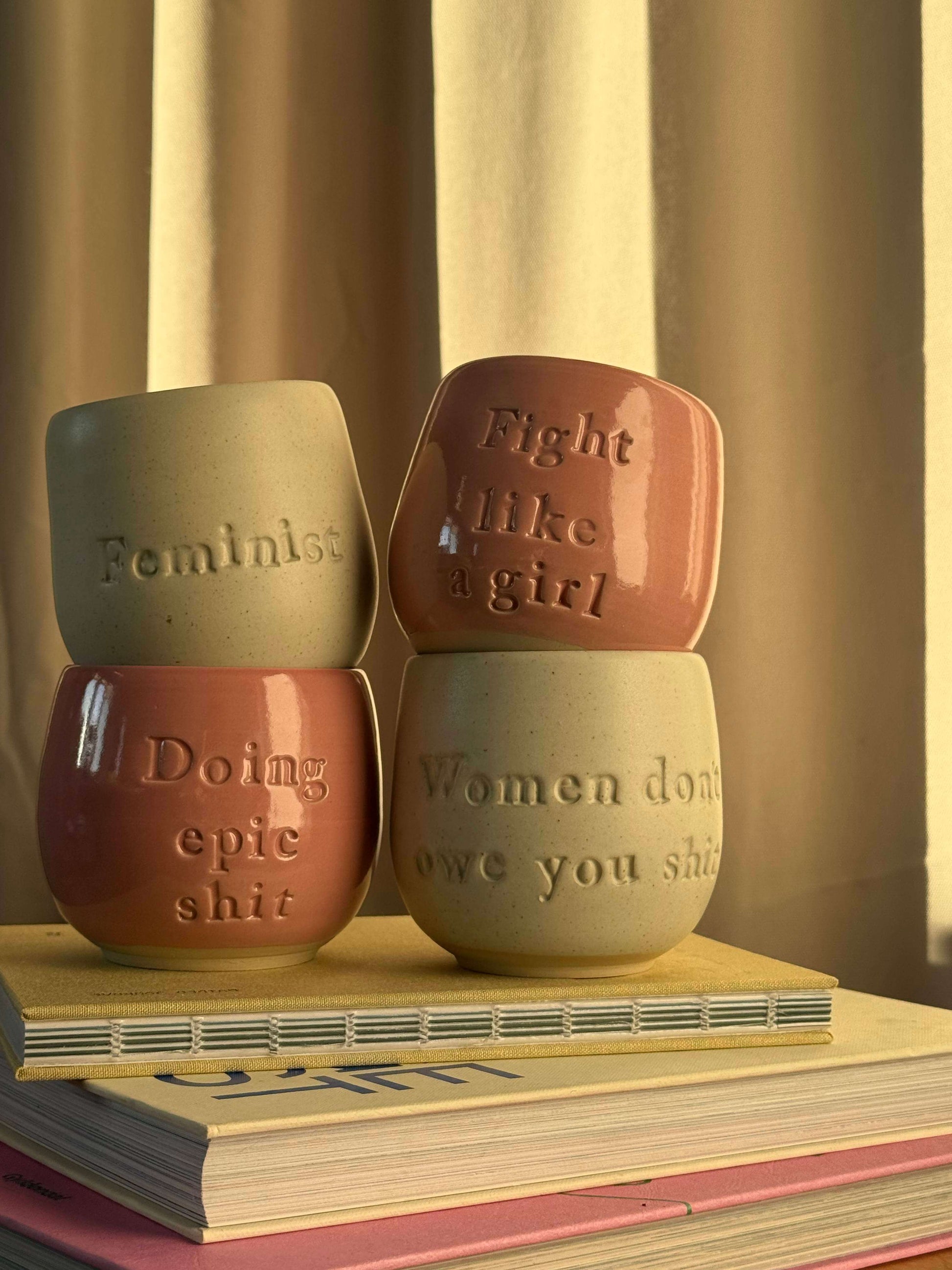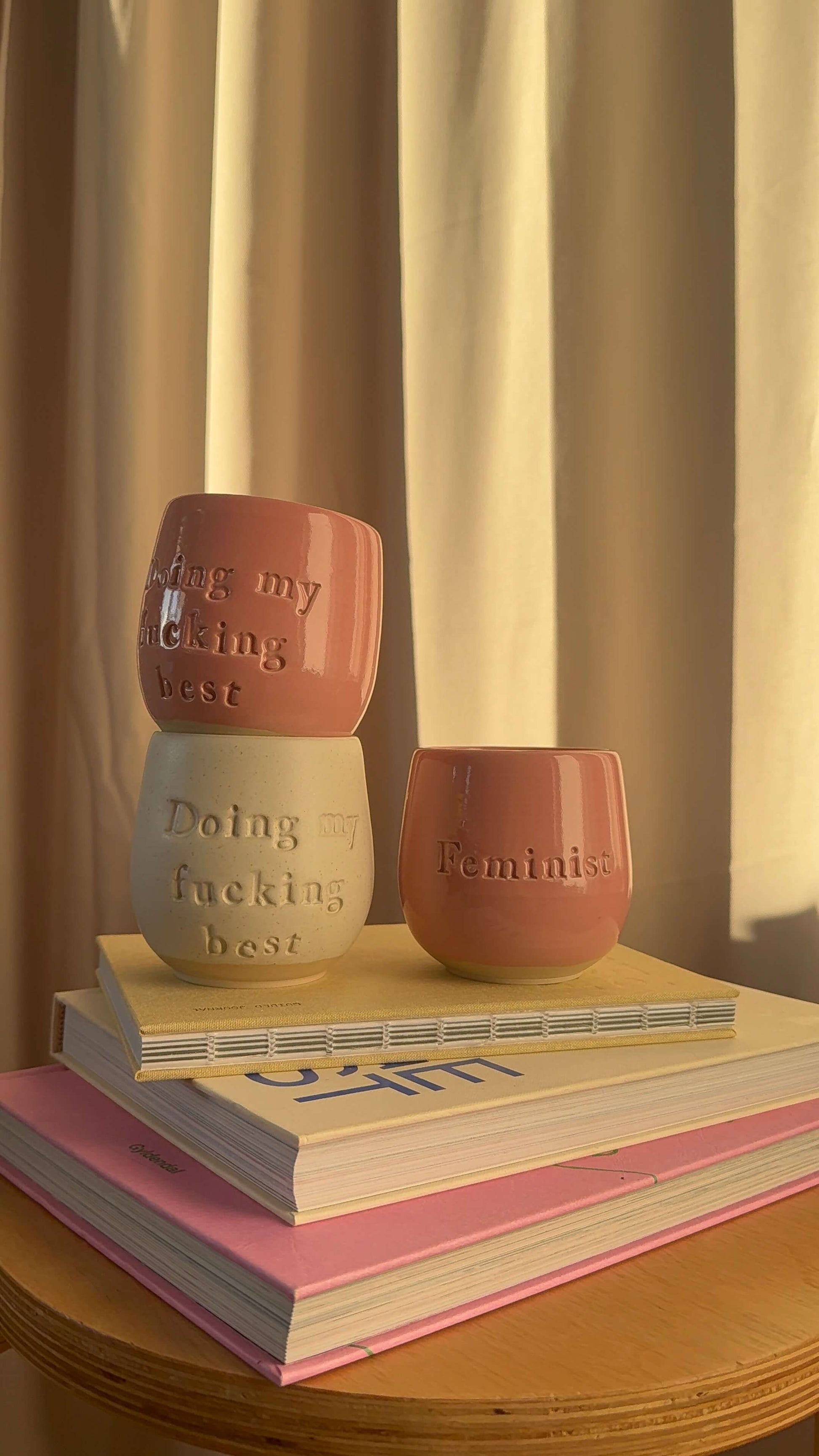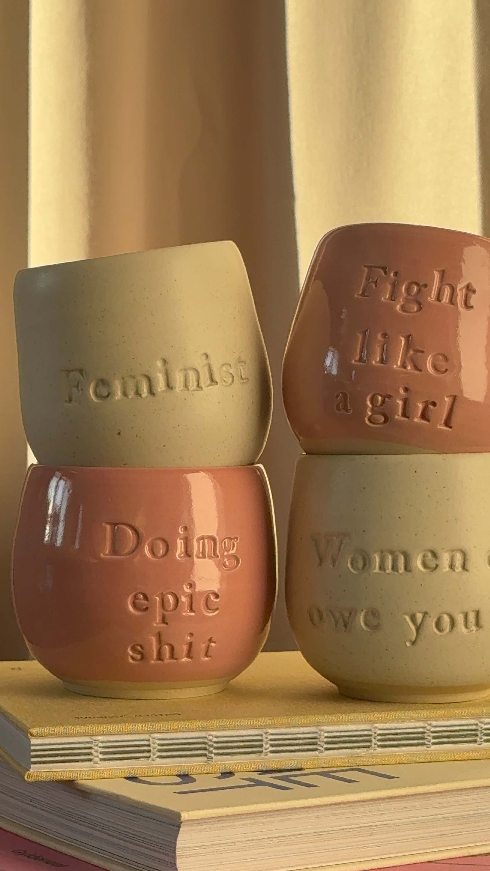 Disse statement-kopper er alle hånddrejet i Danmark af Jahaa Keramik. Hver enkelt kop er formet i hånden og bærer sit eget unikke udtryk – med små variationer i farve, form og størrelse, som vidner om det ægte håndværk bag.