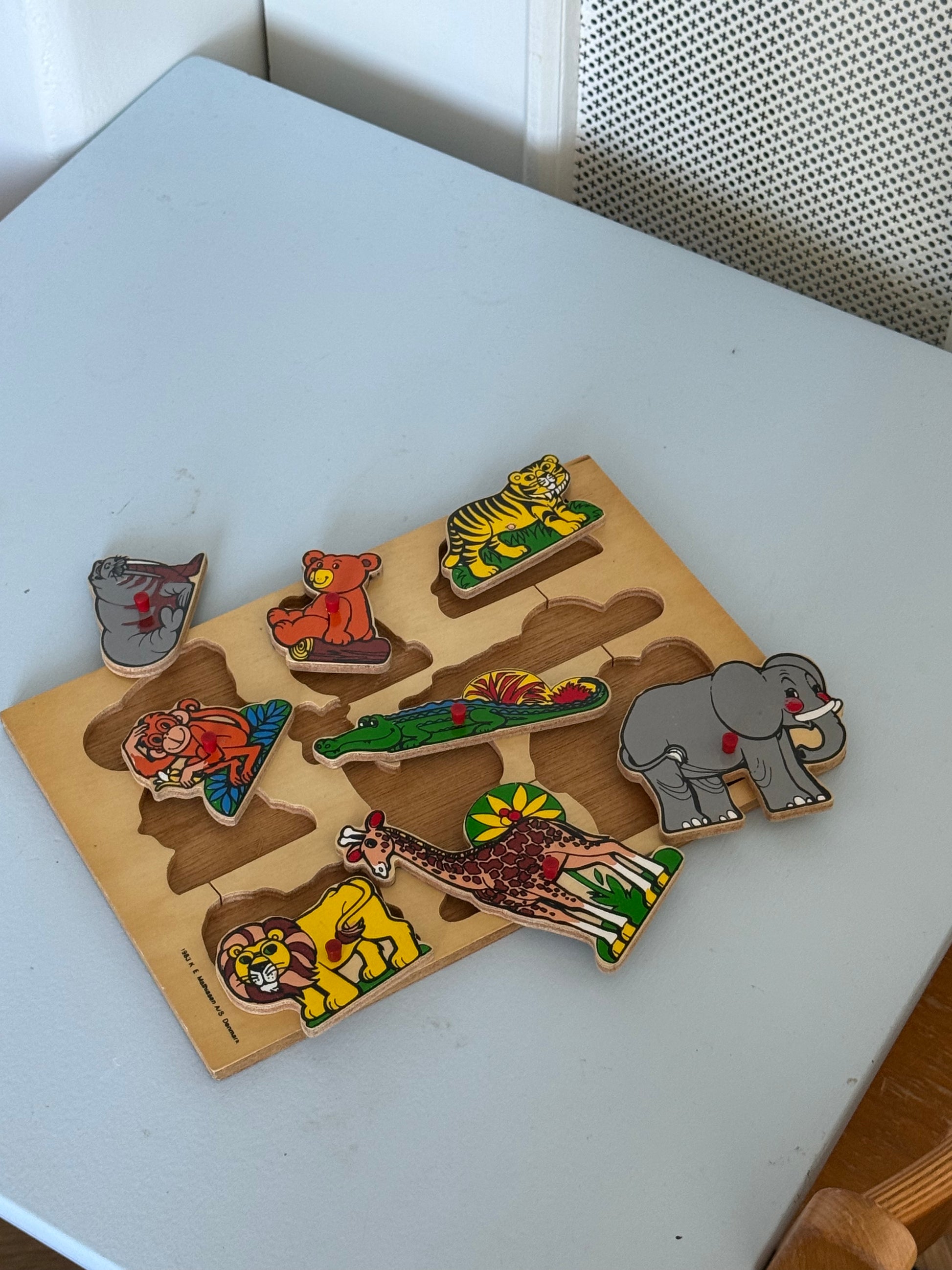 Et fint træpuslespil med eksotiske dyr. Et farverigt og legende motiv, der inviterer til både fordybelse og fantasifuld leg 🤍